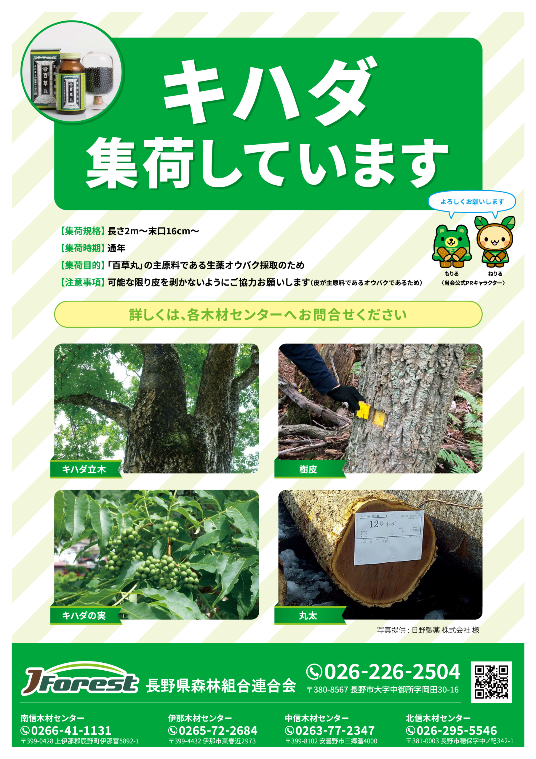 2026年2月24日 / 最終更新日時 : 2026年2月24日 naganomoriren お知らせ キハダ集荷しています 「百草丸」の原材料である生薬オウバク(キハダの周皮を除いた樹皮)採取のためキハダを集荷しています。樹皮を採取した後の原木が製材用としての利用が可能となったため、一般の相場より高値での取引が可能となります。 出荷については各木材センターへお問合せください。ご協力よろしくお願いします。 集荷規格:長さ2m~ 末口16㎝~ 集荷時期:通年 注意事項:可能な限り皮を剥かないようにご協力お願いします (皮が主原料であるオウバクであるため)